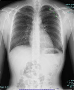 左肺上部(写真では右上部)の緑の矢印が、萎んだ肺と漏れた空気との境界である線状影を示しています。よく見ないと見落としてしまいます。