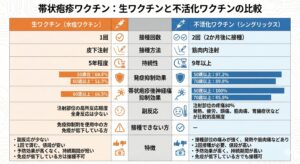 | 特徴 | 副反応が少ない 1回で済む、値段が安い 予防効果が高くなく、持続期間が短い 免疫が低下している方は接種不可 |