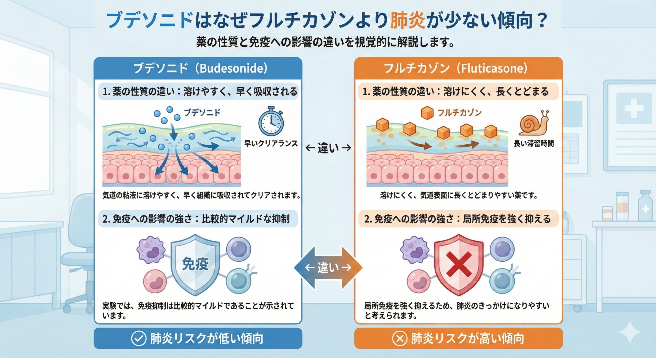 ブデソニドは気道の粘液に溶けやすく、早く組織に吸収されてクリアされます。フルチカゾンは溶けにくく、気道表面に長くとどまりやすい薬です。長く残るほど局所の免疫を抑えやすく、肺炎のきっかけになりやすいと考えられます。