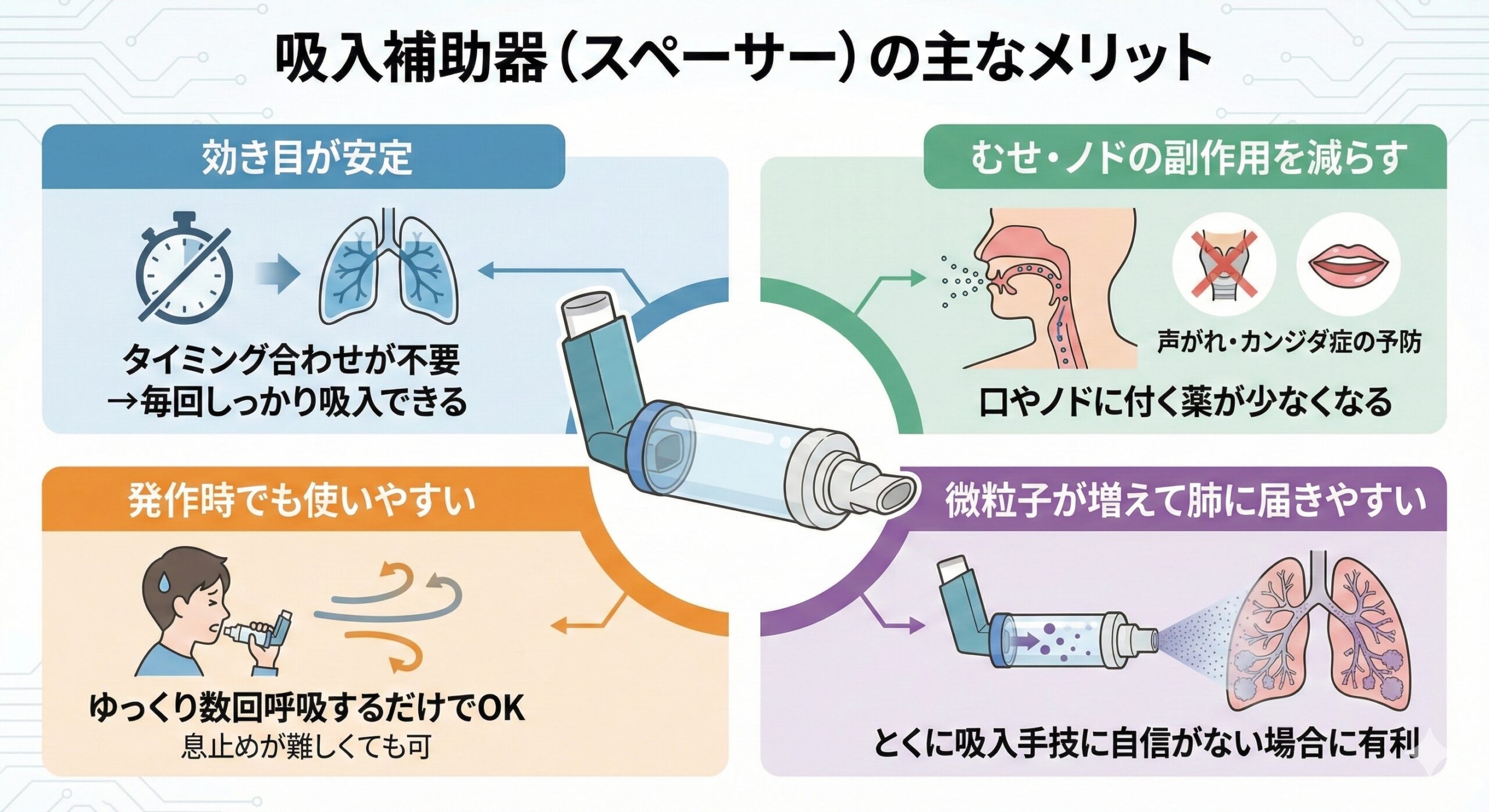 ・むせ・ノドの副作用を減らす:口やノドに付く薬が少なくなる(声がれ・カンジダ症の予防)