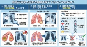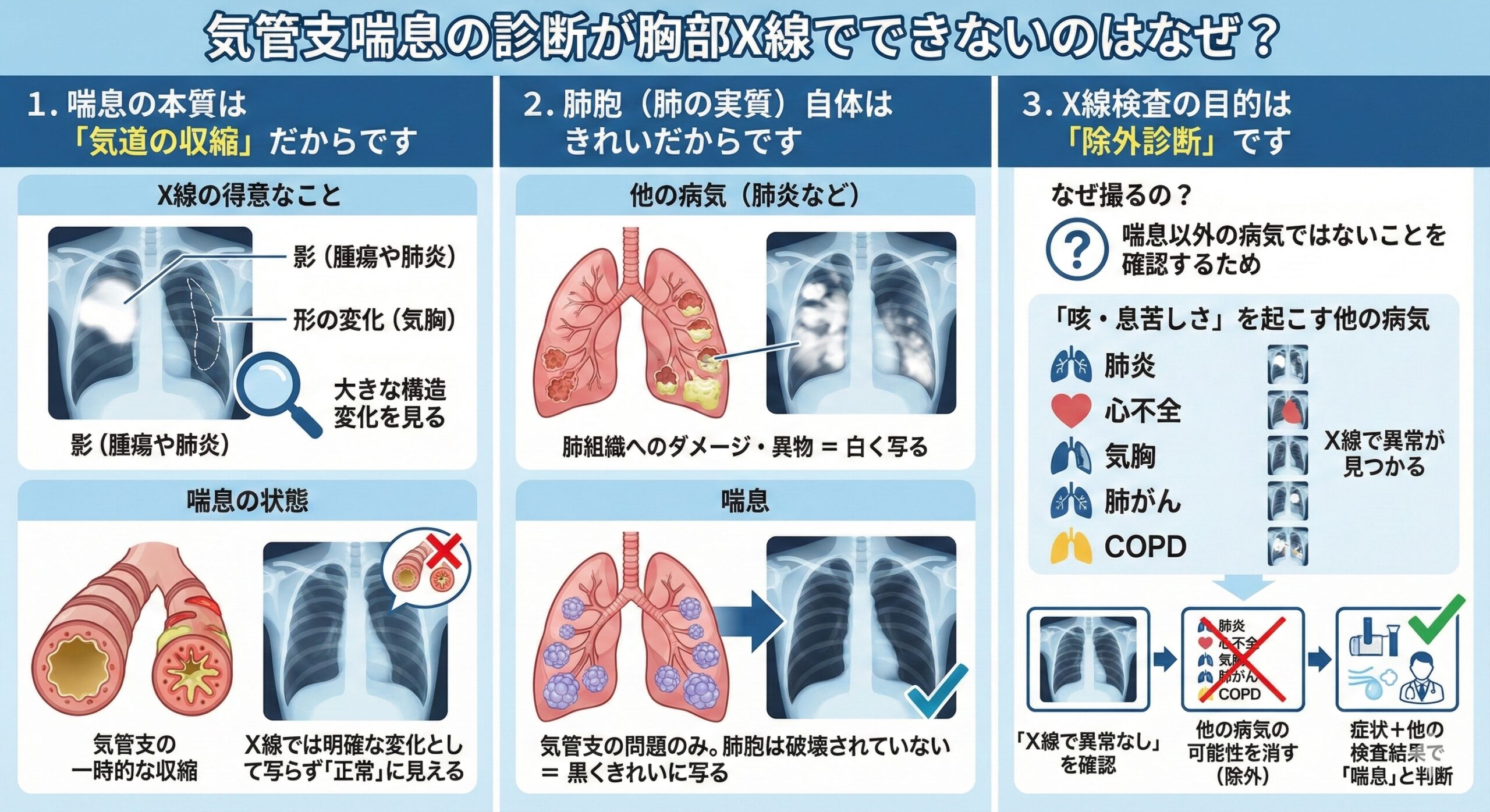 これらはX線で異常が見つかる病気です。「X線で異常がない」ことを確認することで、これらの病気の可能性を消し(除外診断)、症状や他の検査結果と合わせて「やはり喘息の可能性が高い」と判断するために撮影を行います。