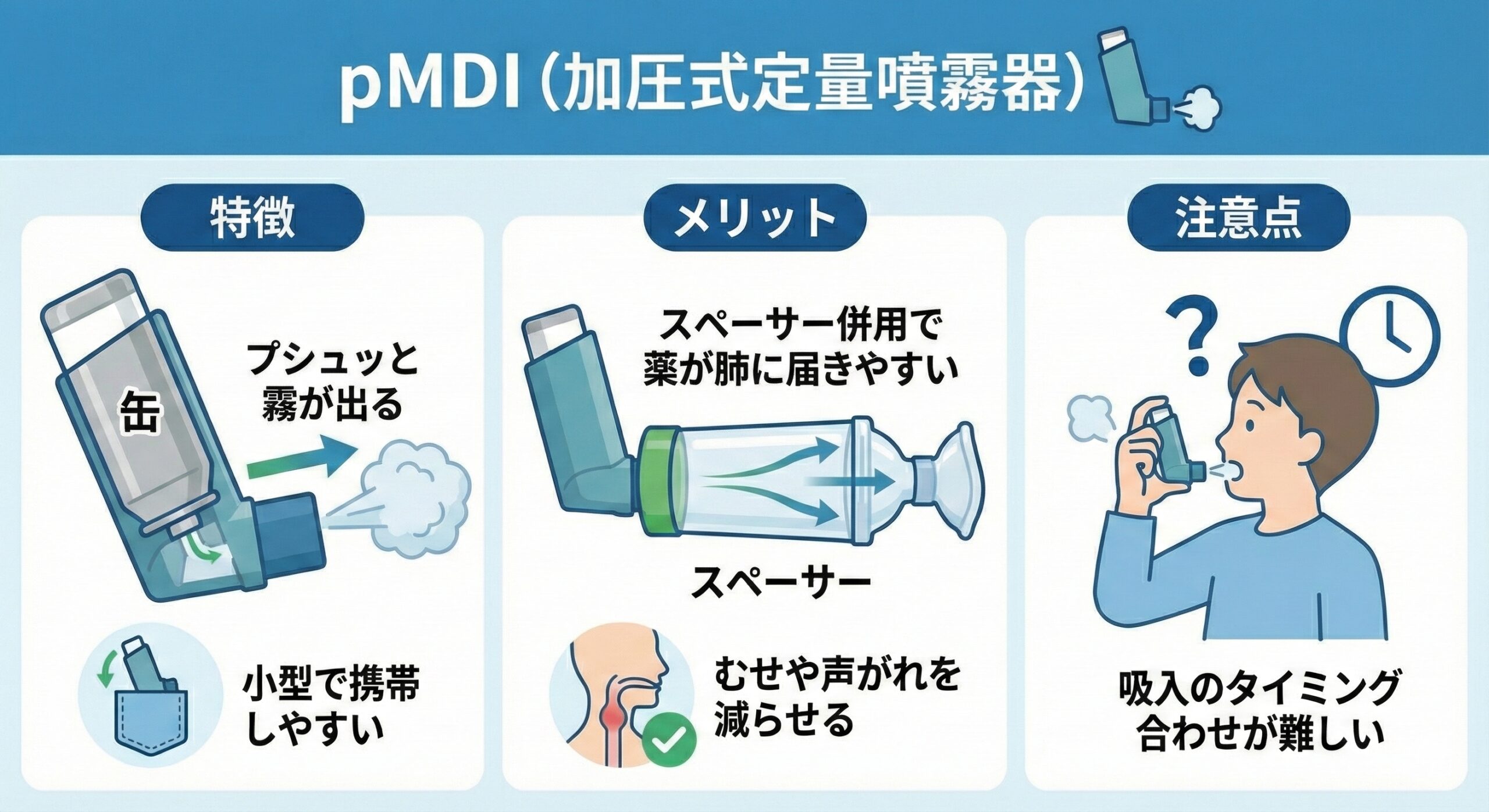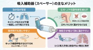 ・メリット:スペーサー併用で薬が肺に届きやすく、むせや声がれを減らせる。