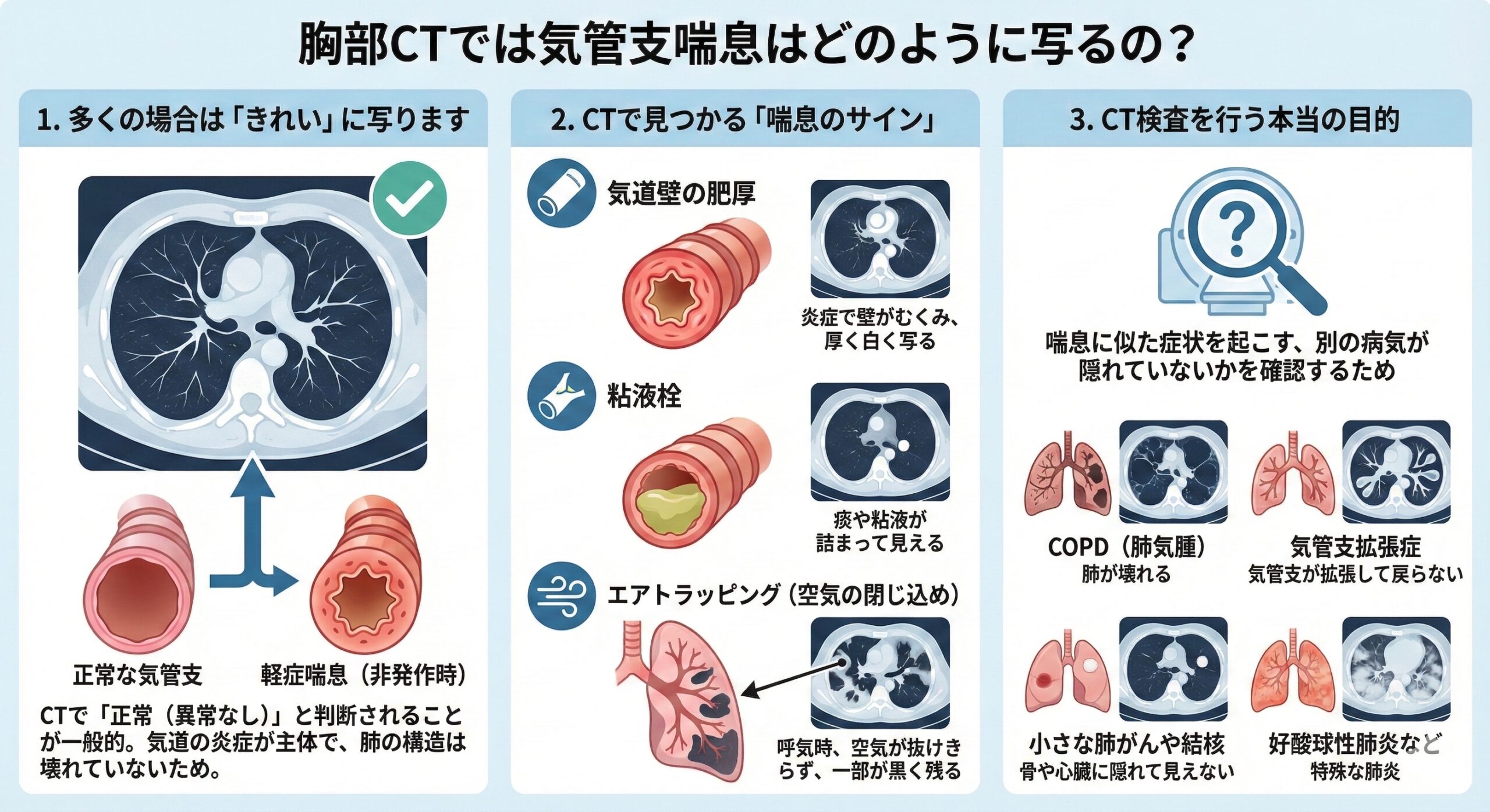 胸部CTは、喘息そのものを「確定診断」するための検査ではありませんが、**「隠れた別の病気がないか」**を調べ、より安全で確実な治療方針を決めるために非常に重要な検査です。