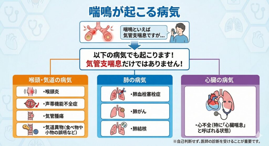 ではなぜ喘息の患者さんにもレントゲンを撮るのかというと、**「喘息以外の病気ではないことを確認するため」**です。 「咳が出る」「息が苦しい」という症状は、以下のような他の病気でも起こります。