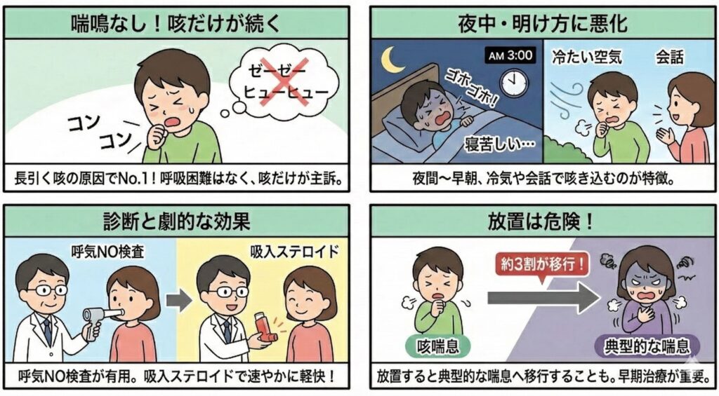 ・冷たい空気を吸い込んだり、運動をしたりすると咳き込む早めの受診と適切な治療が大切です