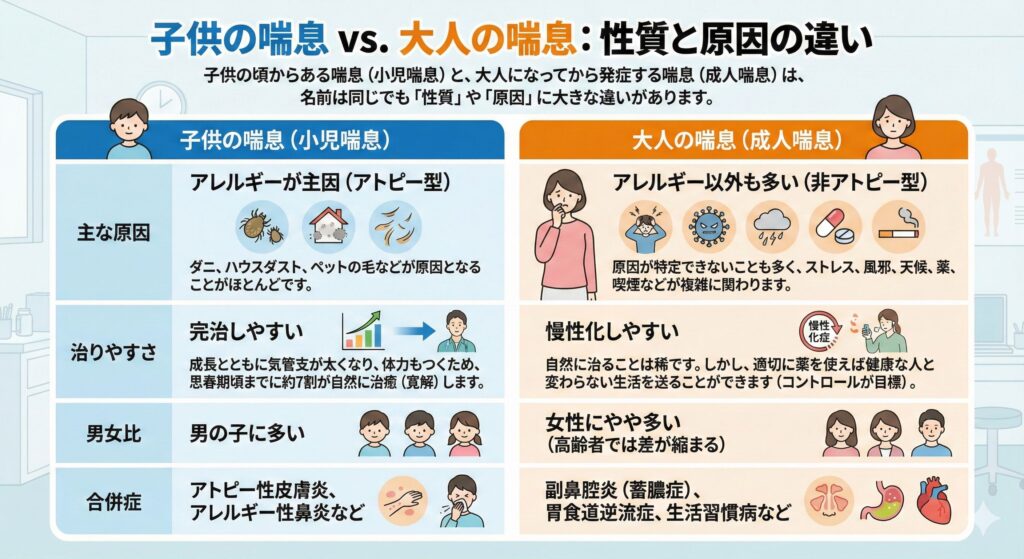 子供の頃からある喘息(小児喘息)と、大人になってから発症する喘息(成人喘息)は、名前は同じでも**「性質」や「原因」に大きな違い**があります。