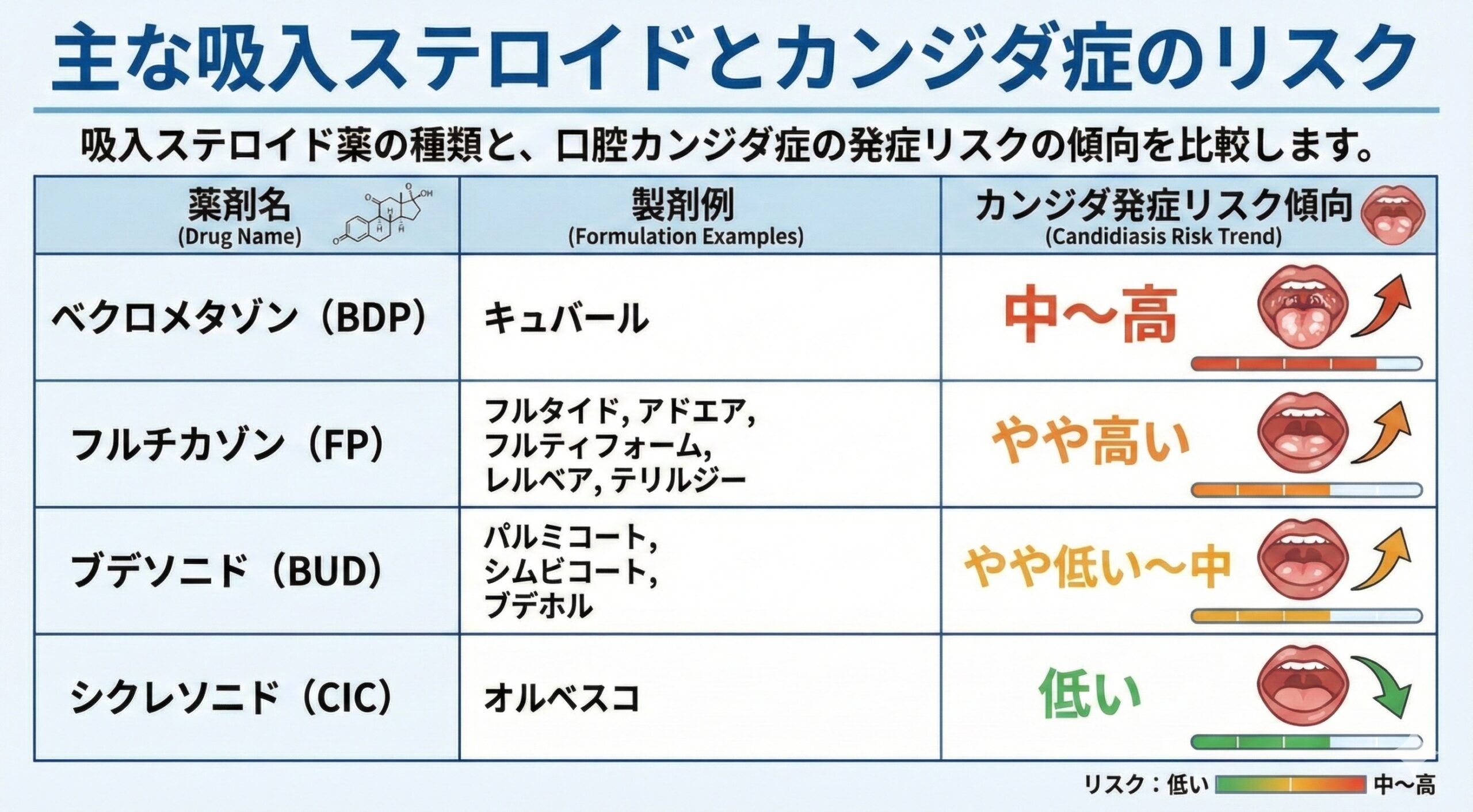ブデソニド、ベクロメタゾン、シクレソニドはリスクが比較的低いとされています。3)ブデソニドはなぜフルチカゾンより肺炎が少ない傾向?