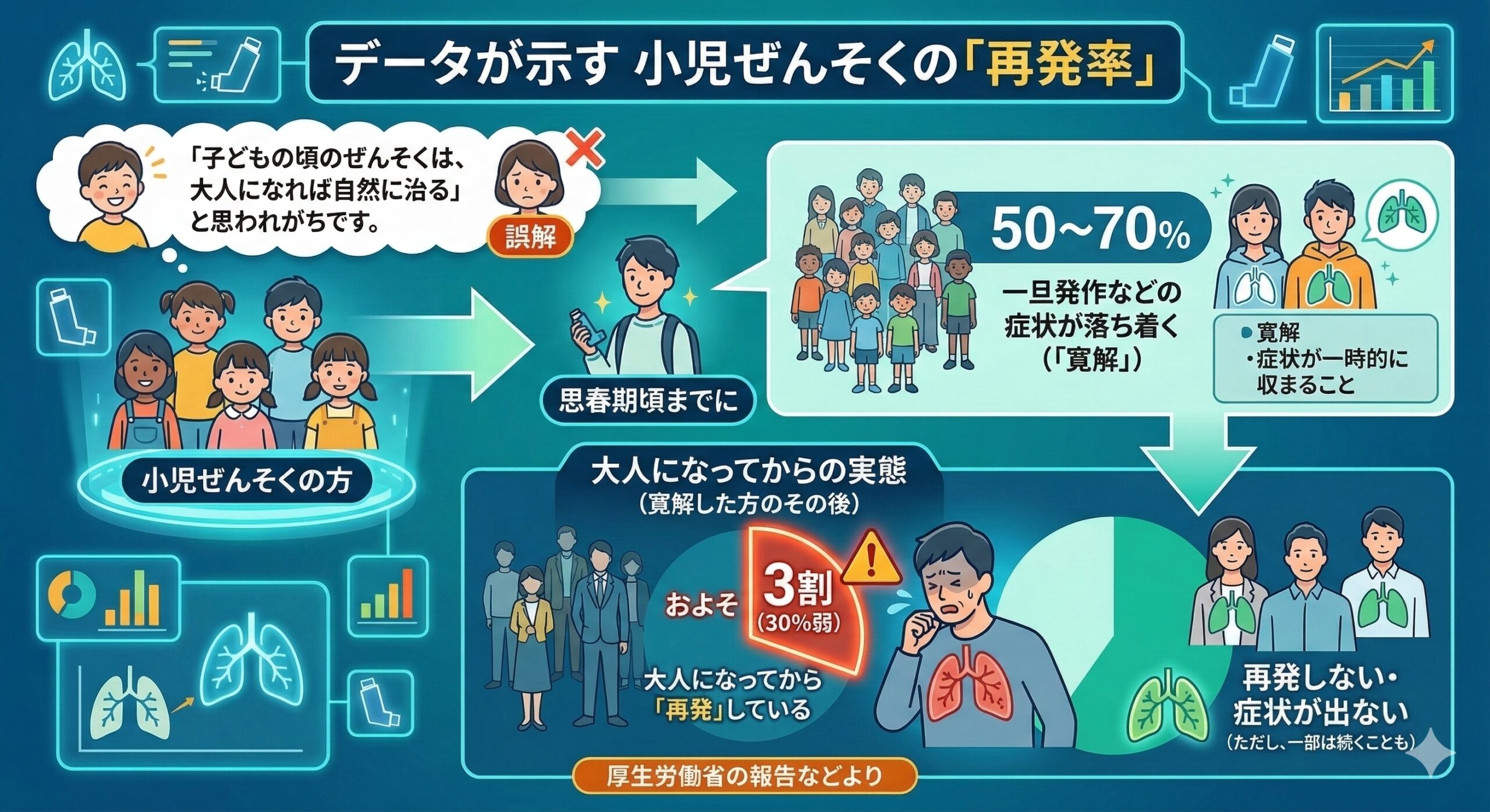 「子どもの頃のぜんそくは、大人になれば自然に治る」と思われがちです。実際に、小児ぜんそくの方の50〜70%は、思春期頃までに一旦発作などの症状が落ち着きます(これを医学的には「寛解」と呼びます)。
