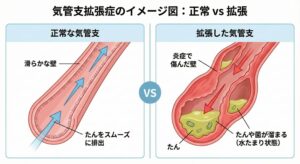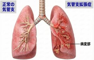 しかし、この病気になると、広がった部分に「たん」や「細菌」が溜まりやすくなり、咳やたんが慢性的に続くようになります。