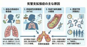 気管支拡張症の原因は一つではありません。日本では主に以下のような原因が多く見られます。