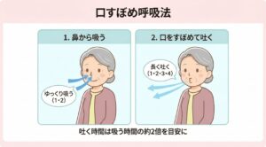 この「動くときの苦しさ」を和らげるために有効なのが、**「口すぼめ呼吸」**です。