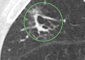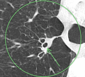③X+5年:下の方の気管支の内腔は消失し、結節状を呈するようになりました(矢印)。