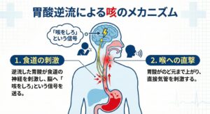 1.食道の刺激: 逆流した胃酸が食道の神経を刺激し、脳へ「咳をしろ」という信号を送る。
