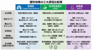 慢性咳嗽の三大原因、「咳喘息」「胃食道逆流症」「後鼻漏症候群」を比較して