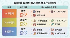 咳の原因を突き止めるためには、**「咳がいつから続いているか(期間)」**が非常に重要な判断材料になります。ここでは、期間ごとの特徴と、疑われる主な病気について解説します。