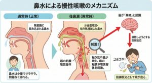 ・症状の特徴: 風邪のあとに喉のイガイガが残り、喉に落ちてくるネバネバした鼻汁が切れにくく、発作のような激しい咳を繰り返します。特に「寝る前」や「朝起きた時」に咳き込みやすいのが特徴です。