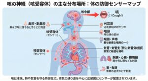 咳は本来、肺や気管を守るための防御反応ですので、空気の通り道を中心に広く「センサー(咳受容体)」が配置されています。