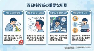 ・特徴: 「コンコン、ヒュー」という特有の音や嘔吐を伴うのが典型的ですが、大人の場合はこうした特徴が出にくく、ただの「長引く空咳」として見過ごされがちです。その結果、3か月以上も咳が続くことがあります。