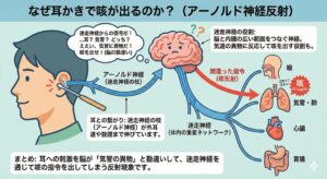 ・脳の勘違い: 耳かきでこの神経が刺激されると、その信号が脳に伝わります。脳は「迷走神経からの信号だ」と受け取りますが、それが「耳からの信号」なのか「気管からの信号(異物がある!)」なのかを区別できず、間違って**「気管に異物がある」と判断して咳反射の指令を出してしまう**ために起こります。