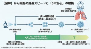 医師の言葉の最大の根拠は、**「がん細胞が成長するスピード」と「CT検査の精度の高さ」**にあります。 以下の図をご覧ください。