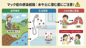 ・水や土壌など自然界に広く存在する菌を吸い込むことによって感染する。