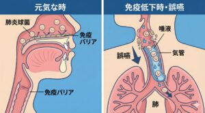 右側(免疫低下時・誤嚥): 免疫バリアが崩れ、菌が唾液と一緒に気管(滑り台のような部分)を通って肺の奥へ落ちていく様子がわかります。