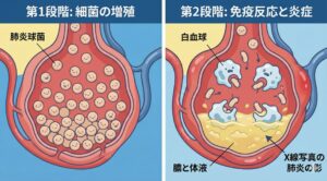 体は菌に対抗するために、血液中の白血球などを肺に集めて戦います。これが「炎症」です。この激しい戦いの結果、肺胞の中に白血球の残骸や浸出液が混ざった「膿(うみ)」や水がたまります。これが、レントゲン写真で白く写る「肺炎の影」の正体であり、咳、痰、発熱、息苦しさといった症状の原因となります。