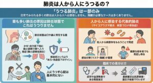このように、肺炎球菌性肺炎は「免疫力の低下」と「菌の侵入」が重なることで発症します。特に高齢の方や持病のある方は、咳をする力や免疫力が弱くなっているため、重症化しやすい傾向があります。