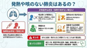 | 典型症状 | 発熱は軽~中等度、湿った咳・痰、食事中/後のむせ、夜間増悪、口腔不潔 | 急な高熱・悪寒、膿性痰、胸痛、息切れ |