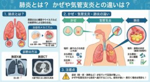 かぜ・気管支炎・肺炎はいずれも咳・痰・発熱など似た症状が出るため、区別が難しいことがあります。さらに、かぜや気管支炎から肺炎へ進行することもあるため、症状が強くなったり長引いたりする場合は注意が必要です。