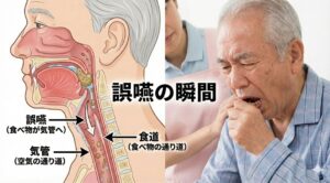 特に高齢者では、飲み込む力(嚥下反射)や咳き込んで異物を外へ出す力が弱くなるため、起こりやすくなります。
