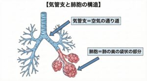 一方、気管支炎は、肺胞へ空気を運ぶための**「気管支(空気の通り道)」**で炎症が起きている状態です。