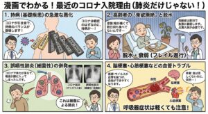 現在のコロナによる入院は、「コロナという感染症」の治療というよりも、**「コロナをきっかけに崩れた全身状態の立て直し」**がメインになっています。