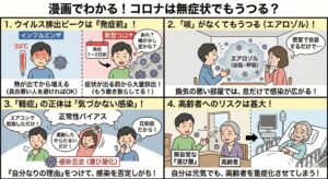 ・排出: 咳やくしゃみ、会話を通じて、高熱の人と同じように周囲にウイルスを撒き散らします。