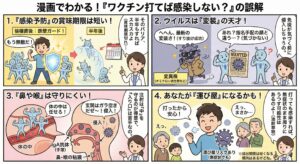 ・変異株の出現: ウイルスは常に形を変える(変異する)ため、ワクチンの「型」と流行しているウイルスの「型」が合わないと、感染自体は防げないことが多いです。