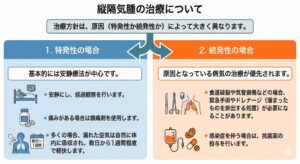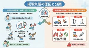 縦隔気腫は、原因によって大きく「特発性(とくはつせい)」と「続発性(ぞくはつせい)」の2つに分けられます。