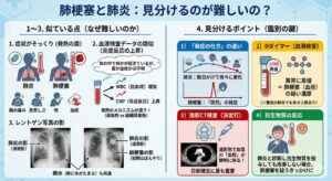 さらに、**「胸の痛み」「息苦しさ」「咳」「血痰」**といった呼吸器特有の症状も共通しているため、症状への問診だけでは区別がつかないことが多々あります。