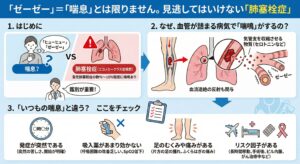 息をするたびに「ヒューヒュー」「ゼーゼー」と音がする(喘鳴:ぜんめい)。 これは気管支喘息の代表的な症状ですが、実は別の怖い病気でも起こることがあります。それが**「肺塞栓症(はいそくせんしょう)」**、いわゆるエコノミークラス症候群です。