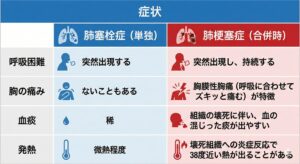 肺塞栓症と肺梗塞症では、自覚症状に以下のような違いが見られることがあります。