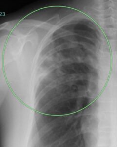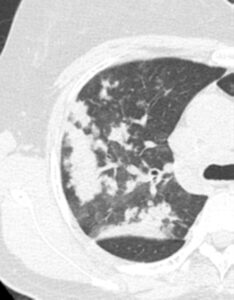 ・影の広がり方(CT検査): 一般的な肺炎は一箇所に固まりますが、乾酪性肺炎は、白い影の**周囲や反対側の肺に、小さな粒状の影(飛び火)**が散らばっていることが特徴です。