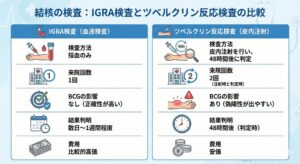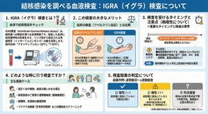 IGRA(イグラ)検査(QFT、T-SPOT): 過去に結核に感染したことがあるか、または現在感染しているかを血液中のリンパ球の反応で調べます。BCG接種の影響を受けずに判定できます。