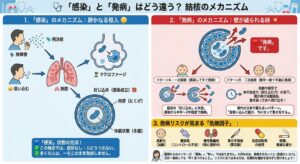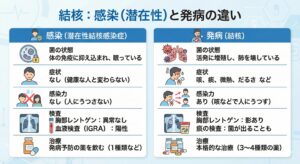 発病: 免疫力が低下した際などに、菌が再び活動を始め、病状が現れる状態です。感染した人のうち、発病するのは10〜20%程度と言われています。