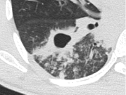これは活動性の(現在進行形の)肺結核の患者さんのCT画像です。 一見してわかる大きな特徴が2つあります。