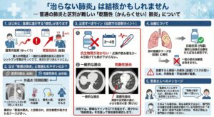 この病気の最大の問題点は、**「一般的な細菌性肺炎と症状やレントゲン写真がそっくりで、見分けがつきにくいこと」**です。