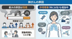 最大の原因は喫煙です。喫煙者は非喫煙者と比べて、肺がんになるリスクが男性で約4.5倍、女性で約2.3倍高くなると言われています。また、他人のタバコの煙を吸い込む「受動喫煙」もリスクを高めます。