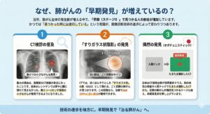 日本は人口あたりのCT保有台数が世界で最も多い国です。別の病気の検査や、人間ドックでたまたまCTを撮った際に、初期の肺がんが偶然見つかるケースも増えており、これが早期発見率の向上に寄与しています。