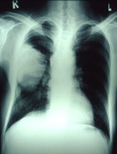 胸部X線で右肺の真ん中に大きな白い塊あり