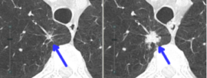 白い塊(青の矢印部位)が1年の経過で急速に大きなっています。手術の結果は早期の肺がん(肺腺がん)でした。