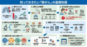 ・検査の流れ:胸部X線検査、胸部CT検査で疑いを持ち、気管支鏡検査などで細胞を採取(生検)して確定診断を行います。