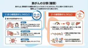 肺がんは、顕微鏡での細胞の形によって大きく2つに分けられ、さらに細かく分類されます。種類によって治療方針が大きく異なります。